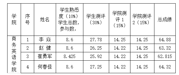 根据《哈尔滨金融学院辅导员年度考核办法(试行)》(哈金院〔2023〕140号)和《哈尔滨金融学院关于开展2023年度辅导员考核工作的通知》精神,商务英语学院坚持定量考核和定性考核、平时考核与专项考核、自我评价与多方评价相结合的方式,经辅导员个人总结述职、学生评议、学院考评,现将考核结果公示如下:
