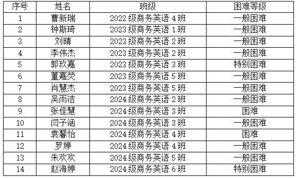 为全面提升资助育人精准化、制度化、规范化、科学化水平,切实保证各项资助政策有效落实到家庭经济困难学生本人,按照《关于印发<黑龙江省家庭经济困难学生认定办法>〔2019〕9号的通知》和《哈尔滨金融学院家庭经济困难学生认定实施细则》(哈金院〔2021〕97号),商务英语学院根据学生个人申请、家庭经济状况,本着公平、公正、公开的原则,严格按照认定程序开展工作,经学院家庭经济困难认定工作组审议,拟确定14人为2025年度春季家庭经济困难补充认定学生,名单如下。
