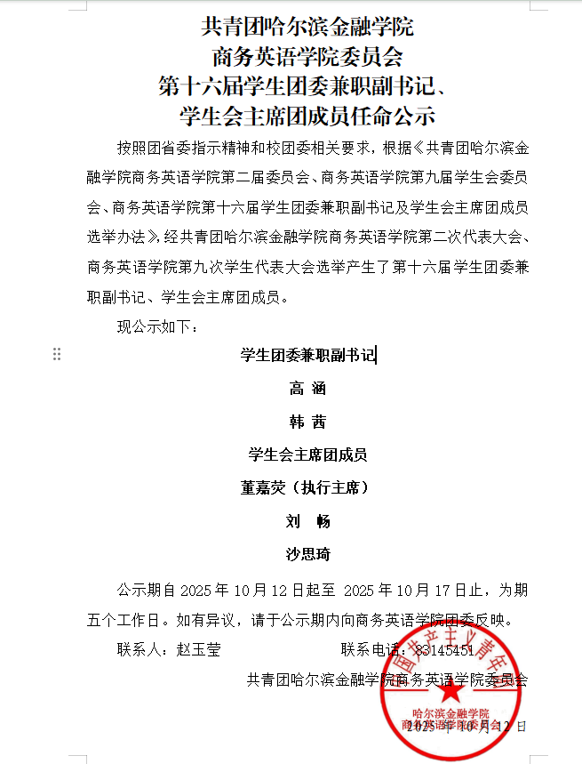 共青团哈尔滨金融学院商务英语学院委员会第十六届学生团委兼职副书记、学生会主席团成员任命公示