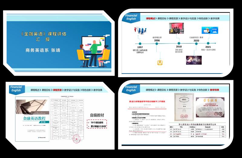 《金融英语》由张靖老师代表团队进行汇报。该课程旨在培养学生的国际视野和使用英语从事相关涉外经济和金融活动的能力,课程教学目标的达成助力我院金融特色人才培养。团队初步建成了“动态立体化、多元一体化”的《金融英语》共享课程资源,教学过程中将教学内容与经济社会发展融合,教学内容与思政元素融合,实现价值引领。