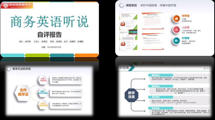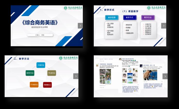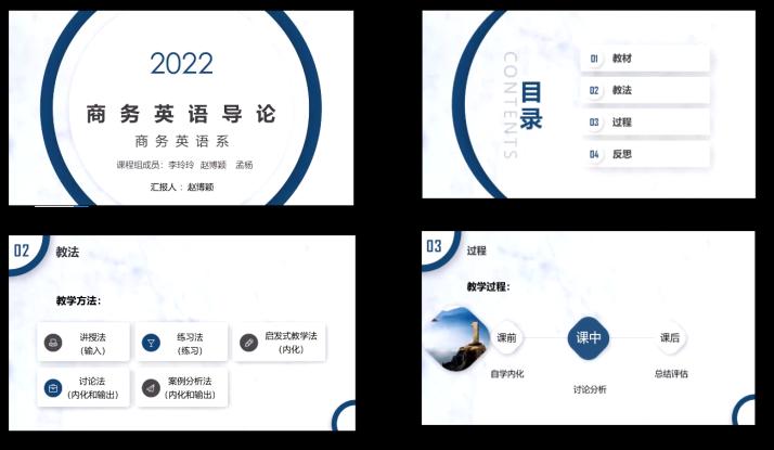 《商务英语导论》由赵博颖老师代表团队进行汇报。课程教学团队在教学中坚持走产学研结合之路,突出专业教育特色。致力于培养适合用人单位需要的高素质应用复合型英语人才,在促进当地经济和社会发展服务方面,取得了一定的成绩。通过课程学习使学生了解市场经济及现代工商企业的运作;熟悉经济贸易理论、市场经济的运作规律、国际经贸活动的基本概念和程序以及相关的市场经营理念及工商企业的管理模式;掌握关于公司组织形式、市场营销、金融、财务、法律、保险、管理等方面的基本商务知识和相关的专业术语;提高使用商务语言技能进行交际的能力。