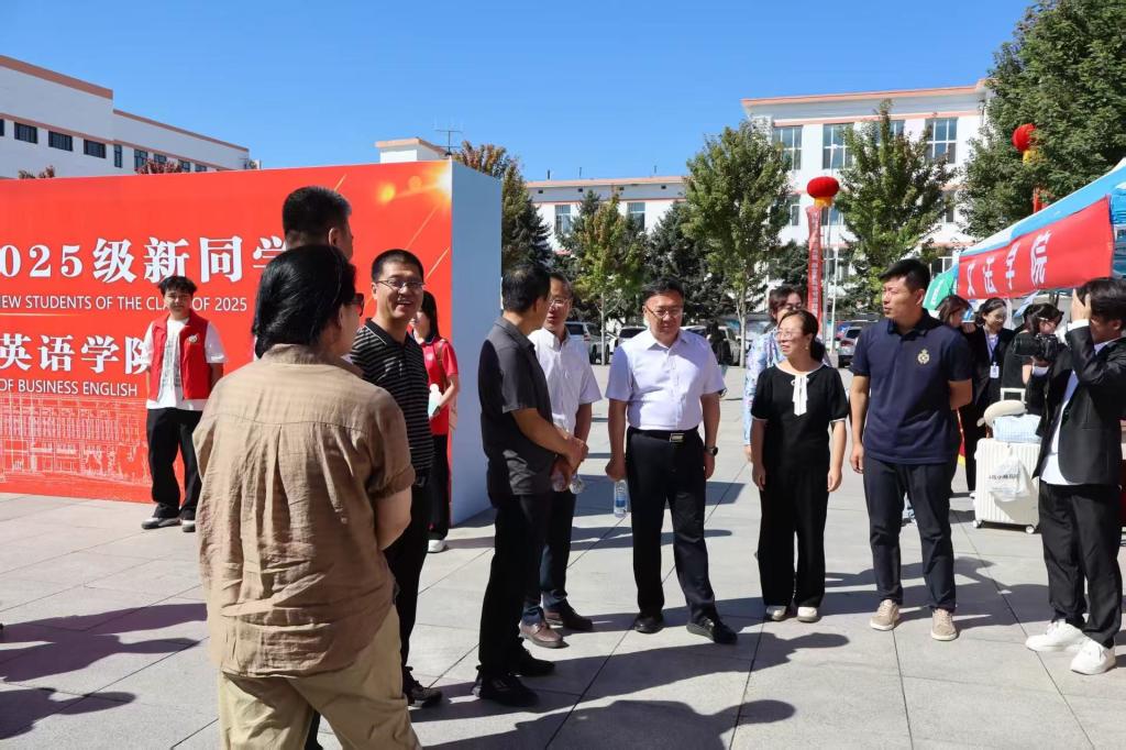 迎新现场,校领导亲临指导,向坚守岗位的学院全体领导班子成员、辅导员及志愿者们致以关怀与慰问,还与新生和家长亲切交流,传递温暖与期许。学院接待站布置温馨周到、突出专业特色,吸引新生和家长驻足合影留念,为新生留下初入商英的美好回忆。