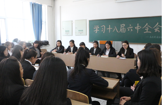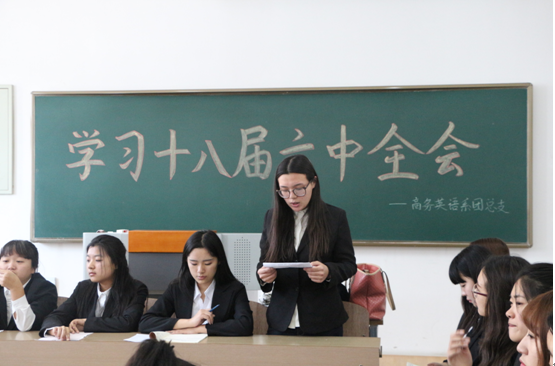 2016年11月22日中午12点,在新教学楼104教室,商务英语系团总支组织全系团干部召开了学习《十八届六中全会公报》座谈会。座谈会由商务英语系团总支副书记曹醒主持,各班团支书、组织委员和宣传委员等团干部参加了会议。