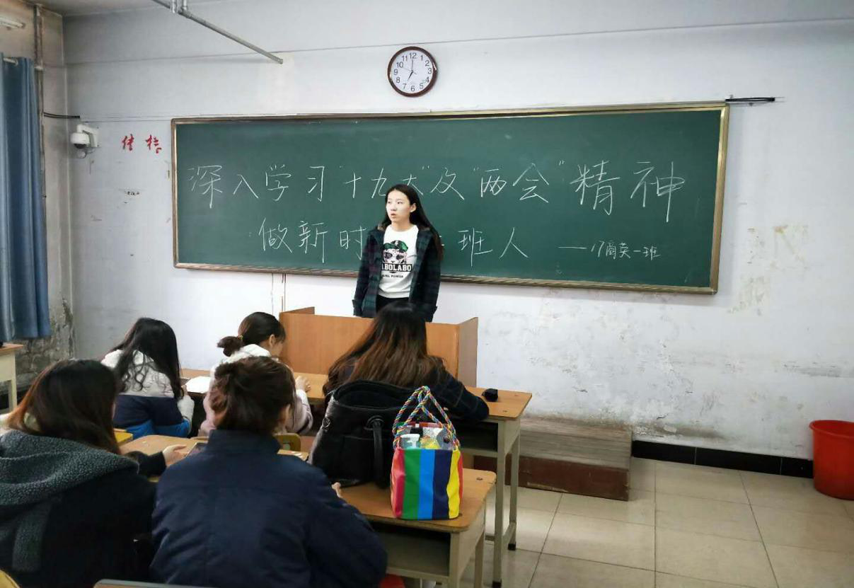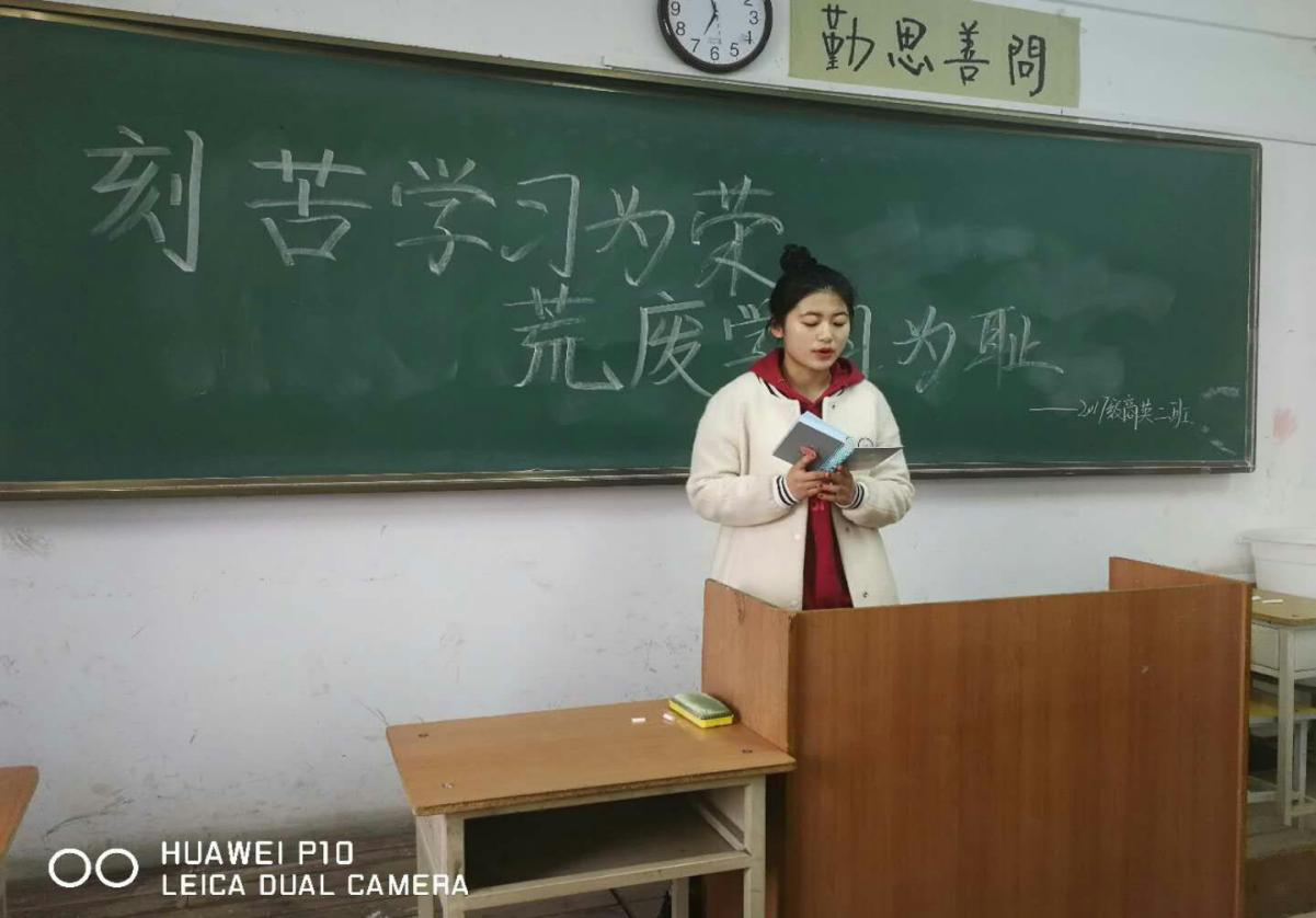 为贯彻落实我院加强学风建设工作的指导精神,切实做好习近平新时代中国特色社会主义思想和党的十九大精神以及“两会”精神的学习宣传贯彻落实,响应我院开展“刻苦学习为荣 荒废学习为耻”为主题的学风建设系列活动号召,商务英语系2017级全体同学于2018年3月22日下午三点在新教教室集中开展加强学风建设活动,本次学风建设的主题围绕深入学习“十九大”及“两会”精神,多学习,读好书,做新时代的接班人。