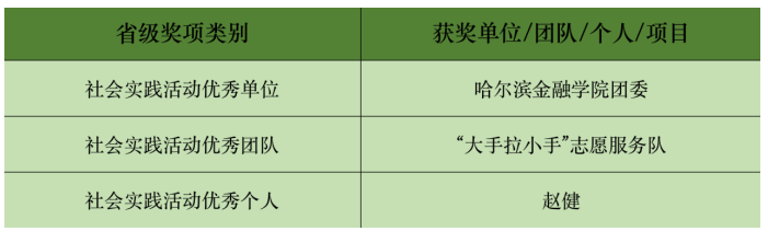 为贯彻落实团中央暑期社会实践活动相关精神,进一步深化“三下乡”社会实践活动效果,经个人(团队)申报、学校推荐、资格审查、专家评审,我院荣获多项省级表彰。“哈尔滨金融学院团委”荣获2022年度黑龙江省大中专学生志愿者暑期文化科技卫生“三下乡”社会实践活动优秀单位;“大手拉小手”志愿服务队荣获2022年度黑龙江省大中专学生志愿者暑期文化科技卫生“三下乡”社会实践活动优秀团队称号;商务英语系团总支副书记赵健荣获2022年度黑龙江省大中专学生志愿者暑期文化科技卫生“三下乡”社会实践活动优秀个人称号。其中,“哈尔滨金融学院团委”将作为黑龙江省推荐对象,在全国范围内进行评选。