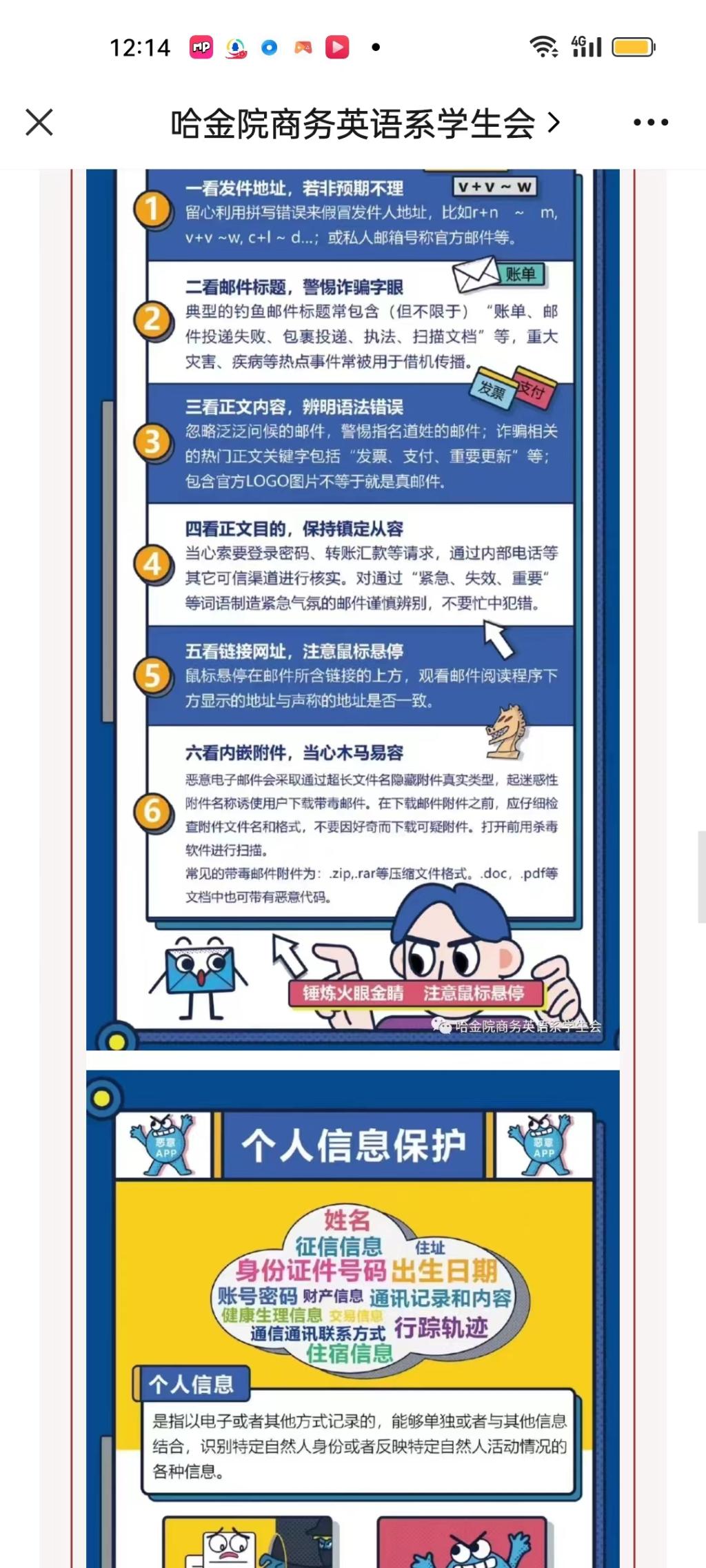 商务英语系各年级通过网络发布网络安全手册,及时进行网络安全隐患排查,教育引导不向陌生人透露自己的个人信息;不再陌生网站输入个人信息;不随便点击陌生链接,保障好个人信息,用户安全。