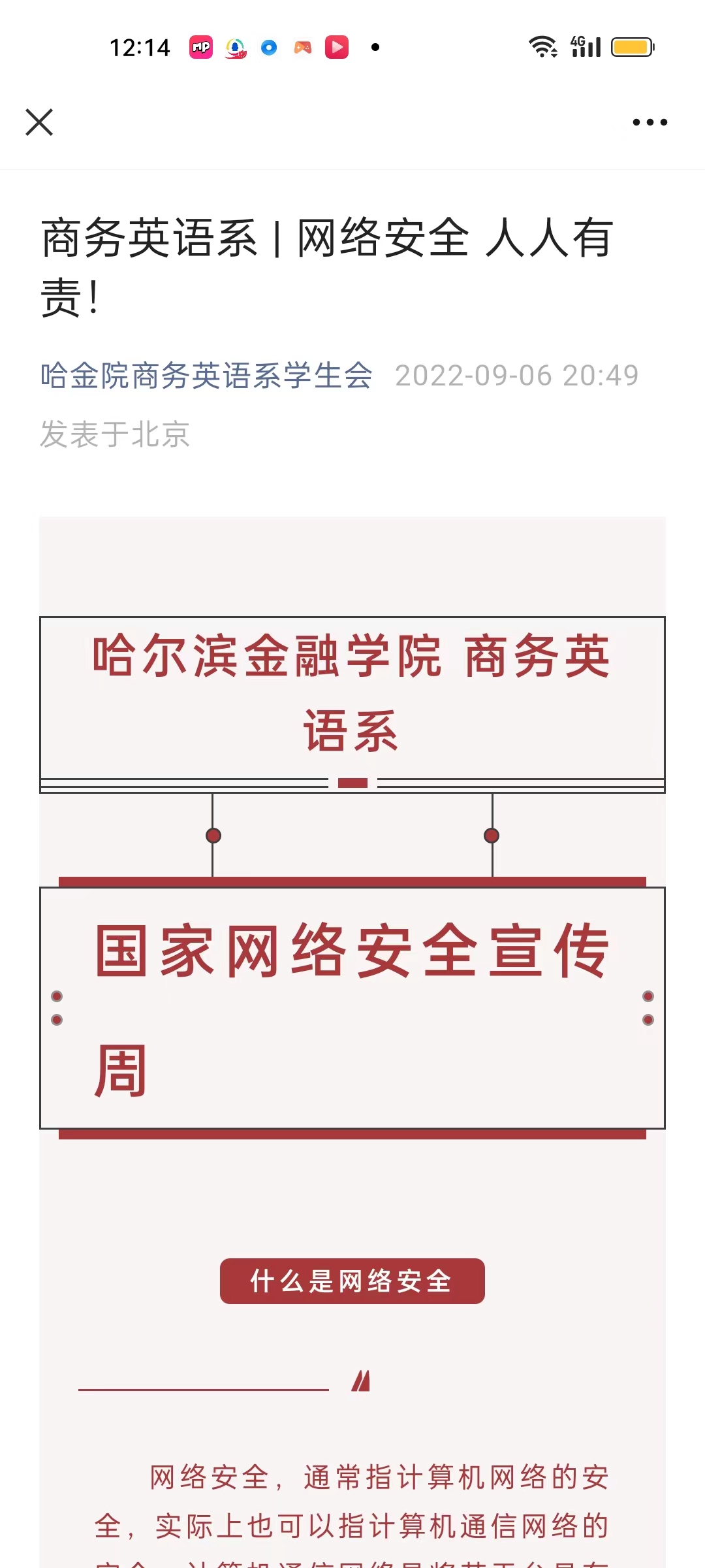 商务英语系积极贯彻落实省教育厅《2022年黑龙江省教育系统网络安全宣传周活动实施方案》要求,结合学院工作要求实际,深入学习贯彻习近平总书记关于网络强国的重要思想,贯彻落实中央关于网络安全和信息化的战略部署,组织开展以“共建网络安全、共享网络文明”为主题的国家网络安全宣传周活动,本次活动采用线上个人自学、线上班会等多种形式开展。商务英语系师生积极参与本次活动,大力宣传网络安全知识,树立网络安全防范意识。