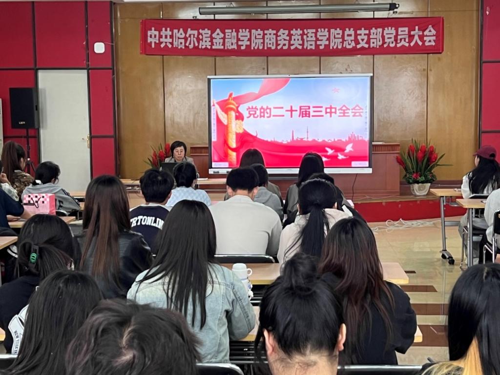 为全面深入学习领会党的二十届三中全会精神,引导广大青年学生把思想和行动统一到党的二十届三中全会精神上来,根据《中共哈尔滨金融学院委员会关于学习宣传贯彻党的二十届三中全会精神的工作方案》和《“金院党旗红”学工宣讲团党的二十届三中全会精神宣讲工作方案》要求,9月29日,商务英语学院党总支副书记李娜面向学生党员、学生干部宣讲党的二十届三中全会精神。