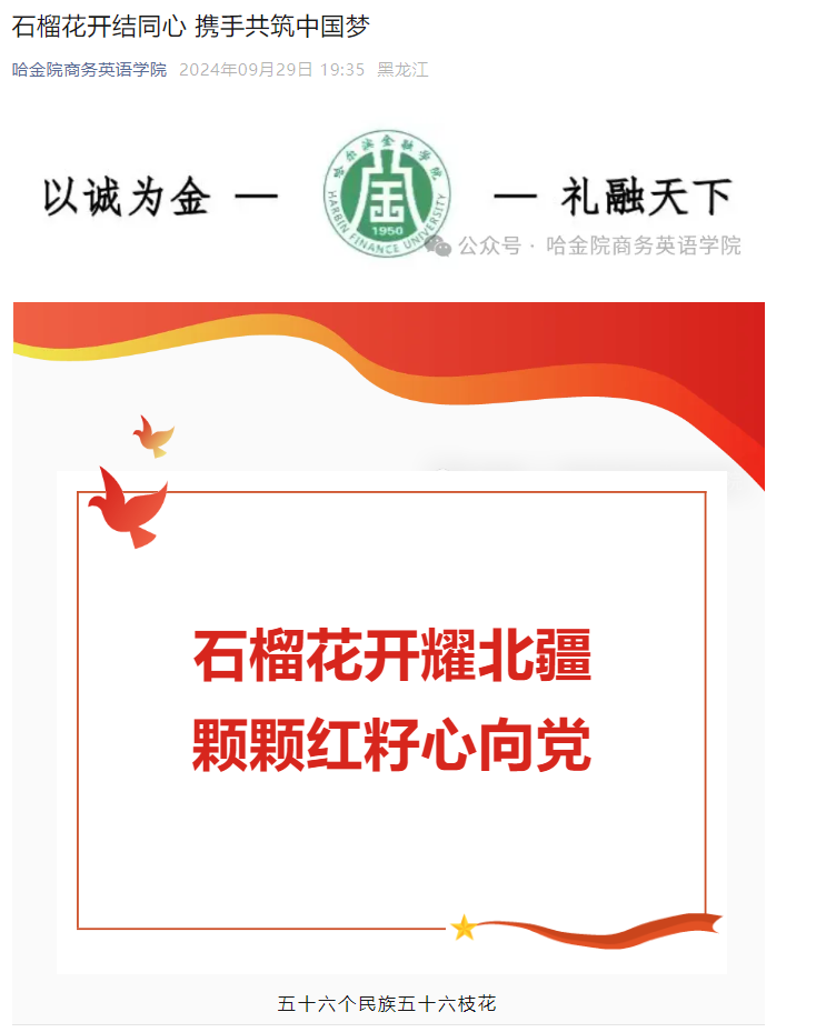 为加强学生对铸牢中华民族共同体意识的理解和认识,营造民族团结进步宣传氛围,商务英语学院通过微信公众号、悬挂宣传标语等方式,展示体现中华优秀传统文化、民族团结进步的内容,不断构筑中华民族共有精神家园。